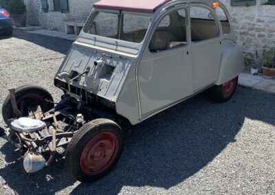 Rénovation totale de Méhari, 4L et 2CV : démontage, remise en état des éléments, réparation des parties abîmées et remontage propre pour redonner une seconde vie au véhicule.